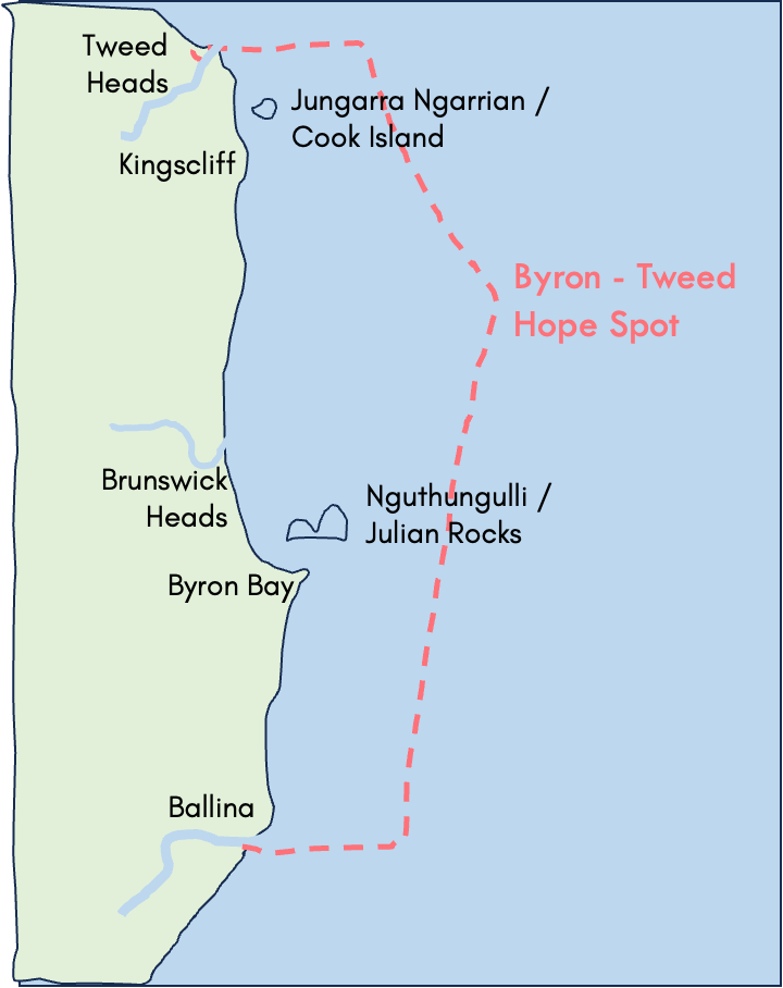 Our Hope Spot runs from the Richmond River to the Tweed River and encompasses the Julian Rocks Nguthungulli Nature Reserve, the broader Cape Byron Marine Park, Cook Island Aquatic Reserve, and related waterways including Brunswick River, Mooball Creek, Cudgen and Cudgera Creeks. Here in Northern NSW we have a unique marine park on one of the most diverse stretches of coastline in the world, protecting high levels of biodiversity, a culturally significant site to local aboriginal communities and the basis of our tourist economy. But this important coastal region is threatened and requires many actions locally to ensure its long term protection.